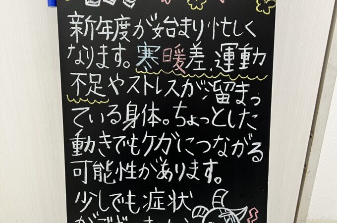 4月になりました!! 新年度が始まり、忙しくなります。 寒暖差、運動不足やストレスが溜まっている身体。 ちょっとした動きでもケガに...